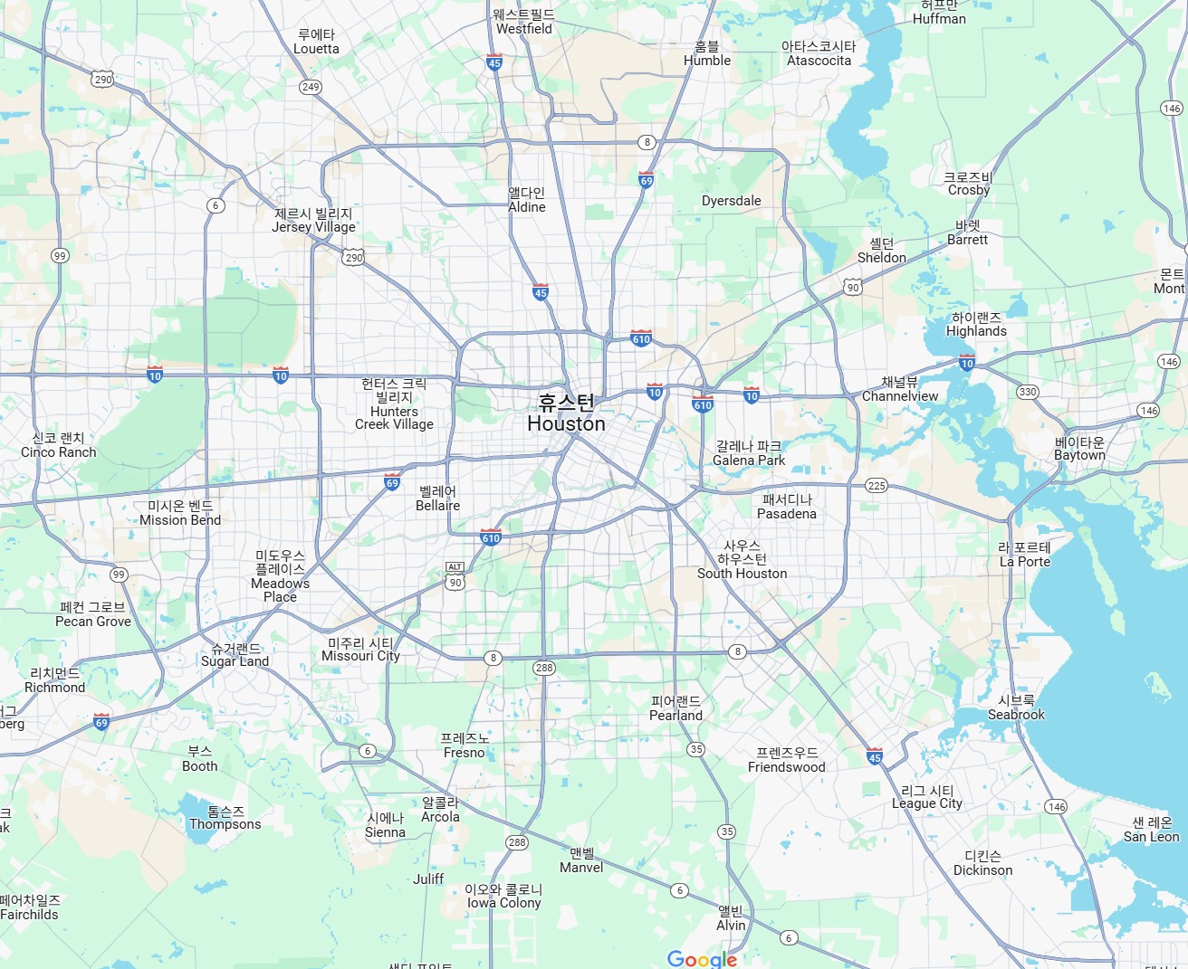 휴스턴은 미국 남부 텍사스주 남동쪽, 멕시코만(Gulf of Mexico)에서 조금 떨어진 내륙에 자리 잡고 있다. **갤버스턴만(Galveston Bay)**과 가까워 항구 도시이기도 하다.