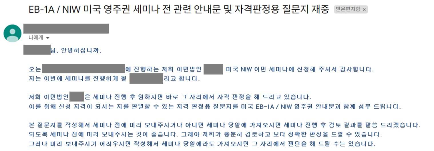 두 번째 업체는 EB2-NIW 세미나를 주기적으로 진행했다. 참석 전 나의 경력 사항을 미리 검토해 준다는 안내를 받았고, 개인정보가 포함돼 있어 Resume를 직접 지참하여 세미나에 참석했다.